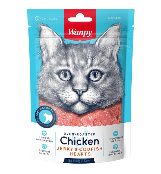 تشویقی گربه ونپی مدل Chicken Jerky & Codfish Hearts وزن 80 گرم
