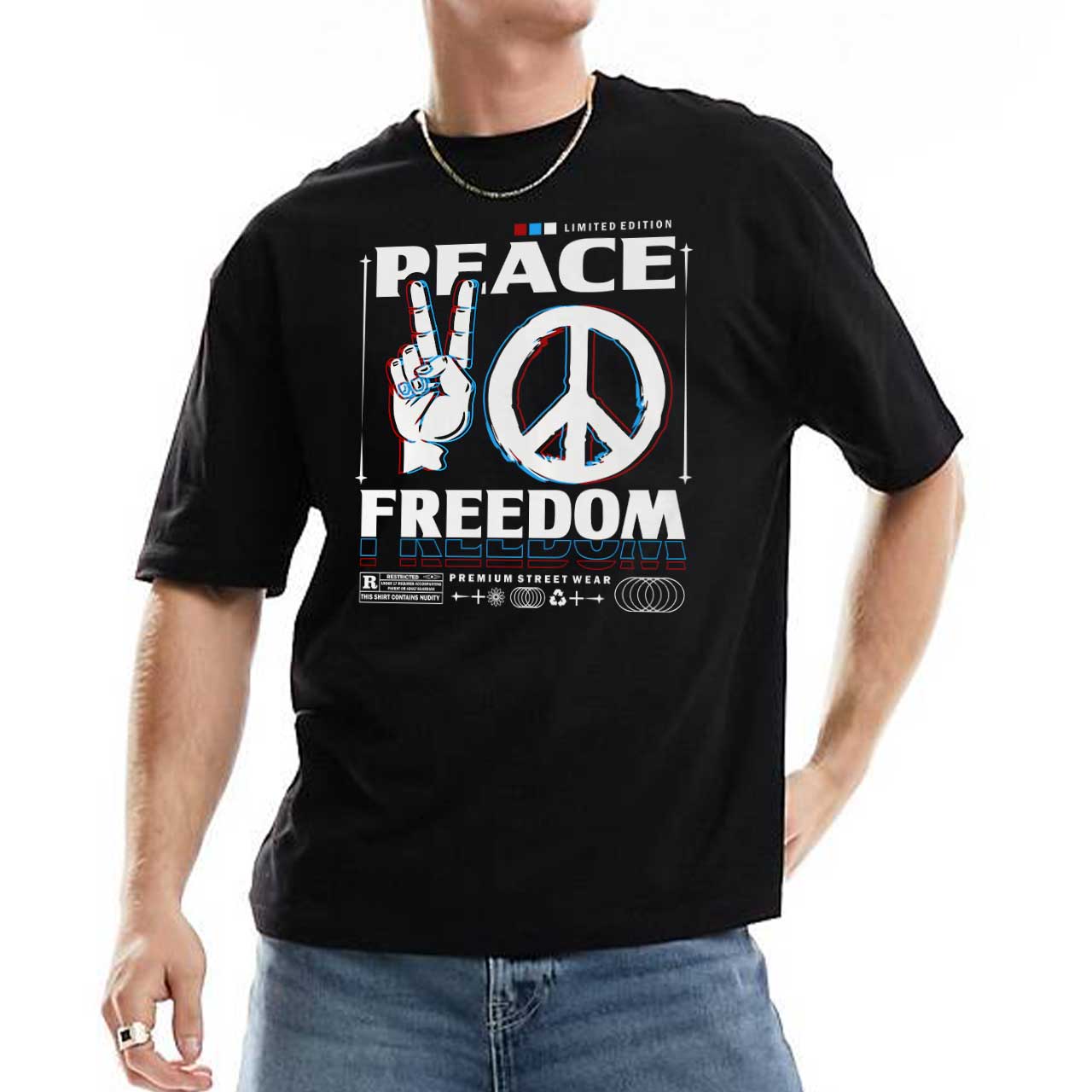 تیشرت طرح صلح و آزادی peace and freedom که شاید با توجه به نمادهای روی آن، بتوان از صلح و برابری هم یاد کرد. نوشته انگلیسی peace به معنی "صلح" freedom به معنای "آزادی" را روی خود نمایش می دهد. سایر نوشته ها هم به تولید تعداد محدود از این محصول و کیفیت برتر آن اشاره دارند.