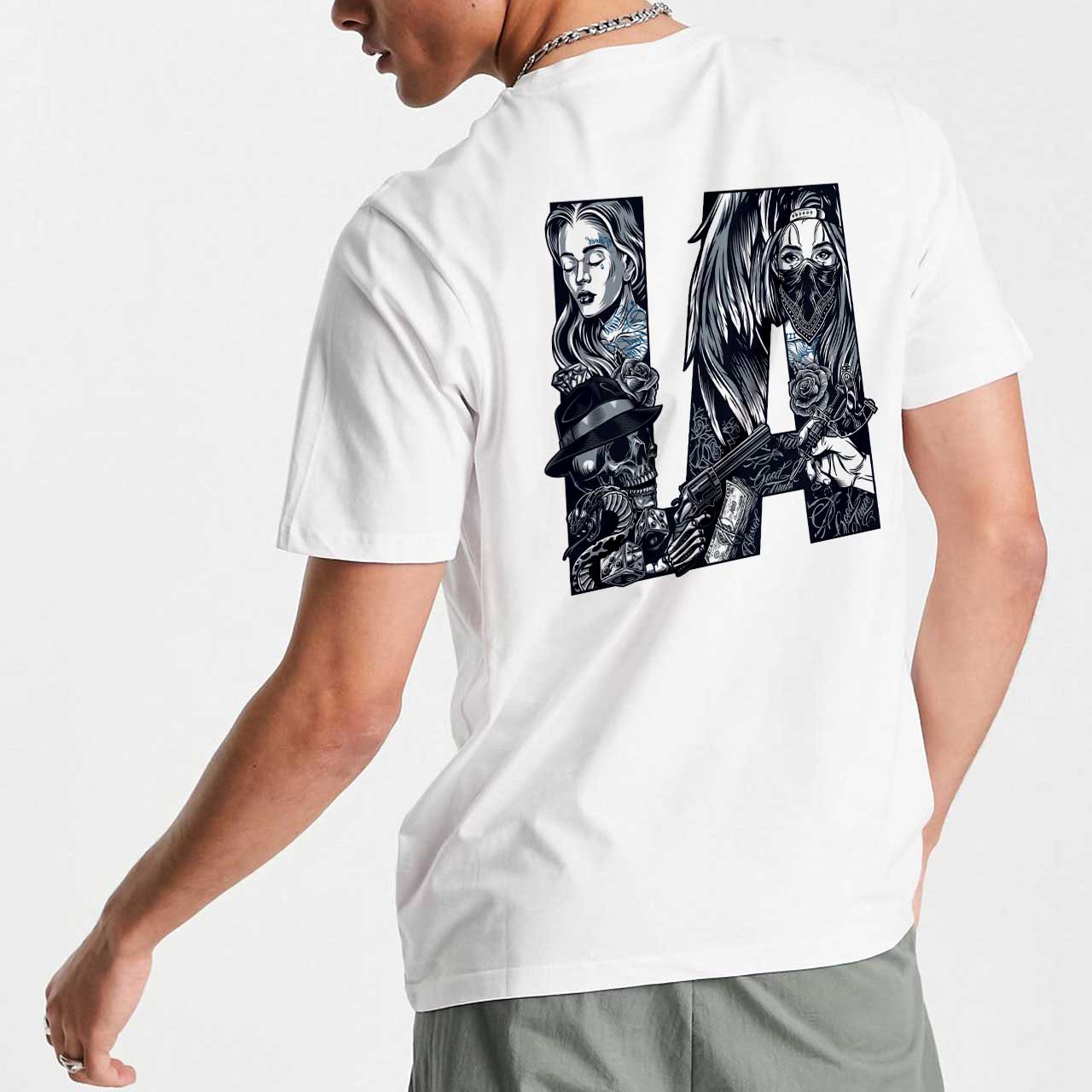 تیشرت طرح لس آنجلس LA اسکلت و مار و دختر نقابدار با طراحی شلوغ و جزئیات پیچیده در هم تنیده، مناسب کسانی است که این طرح ها را می پسندند.