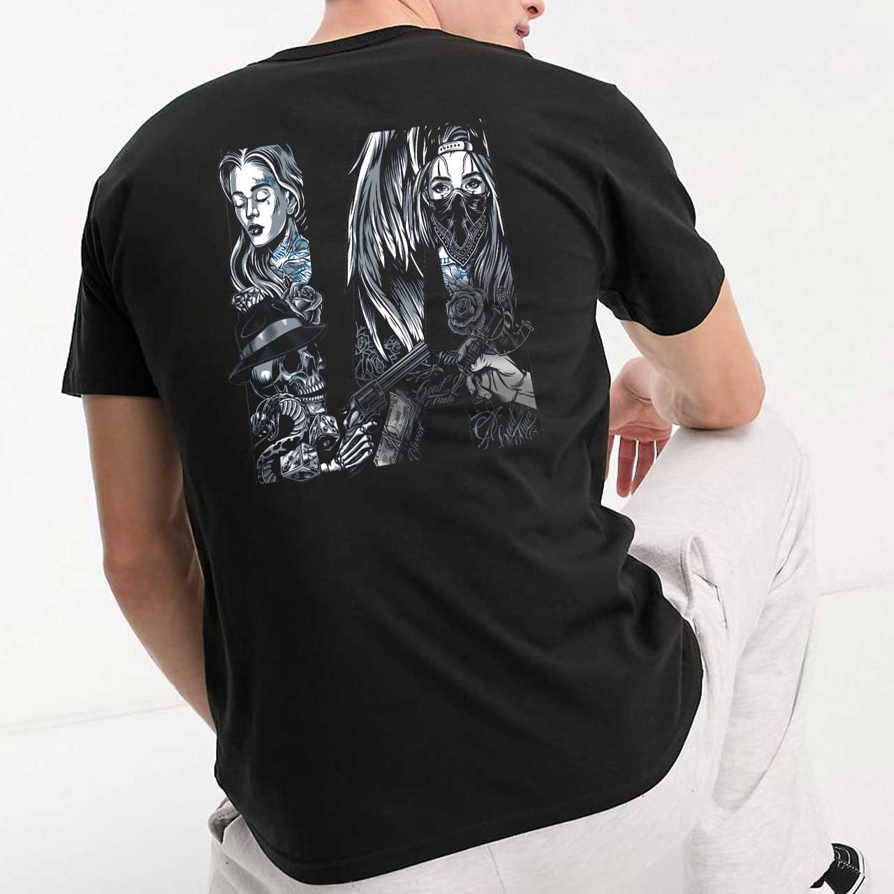 تیشرت طرح لس آنجلس LA اسکلت و مار و دختر نقابدار، نوشته انگلیسی دو حرف L و A، دو عدد تاس، یک اسکلت کلاه به سر در حالی که تفنگی در دست دارد، دو چهره صورت زن که یکی نقاب روبنده دارد، یک دسته اسکناس، یک مار خشمگین که نیشش بیرون است و یک تفنگ مخصوص تتو که نوشته هایی با خط تحریری دستنویس انگلیسی نوشته است را روی خود نمایش می دهد.