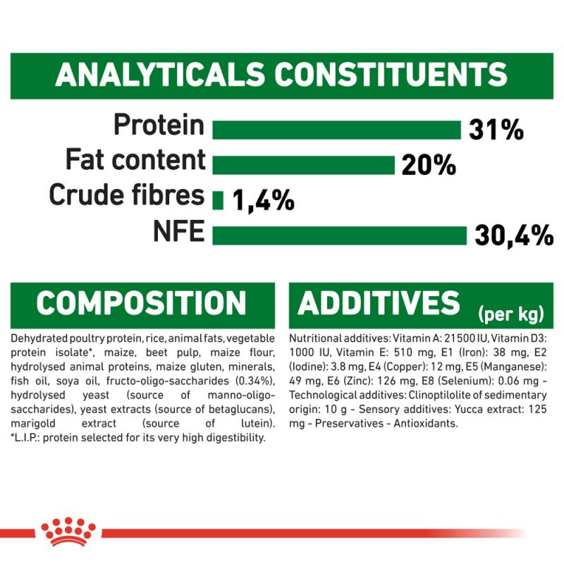 - حداکثر امنیت گوارشی: L.I.P با قابلیت هضم بالا. پروتئینها، فروکتو-الیگوساکاریدها و روغن ماهی برای استفاده موثر از مواد مغذی
