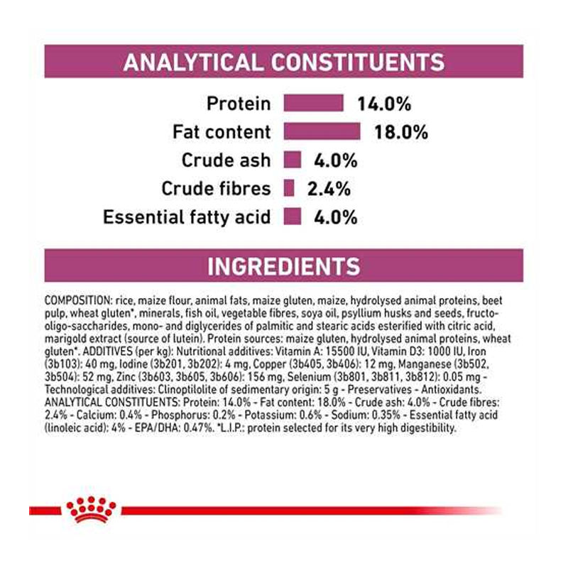 برنج، کنجاله ذرت، چربی حیوانی، گلوتن ذرت، ذرت، پروتئین حیوانی (هیدرولیز شده)، تفاله چغندر، گلوتن گندم*، مواد معدنی، روغن ماهی، لیگنوسلولز، روغن سویا، فروکتو الیگوفاکاریدها، پسیلیوم (پوسته، دانه ها)، پودر گلبرگ گل همیشه بهار (منبع لوتئین)