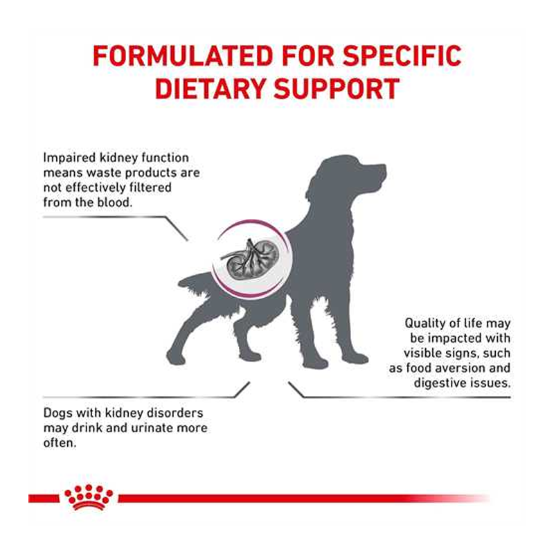 غذای خشک سگ رویال کنین مدل Renal یک غذای پرانرژی برای سگ است که به ویژه برای حمایت از عملکرد کلیه در موارد نارسایی مزمن یا موقت کلیوی، از طریق سطح پایین فسفر و پروتئین با کیفیت بالا، درست شده است.