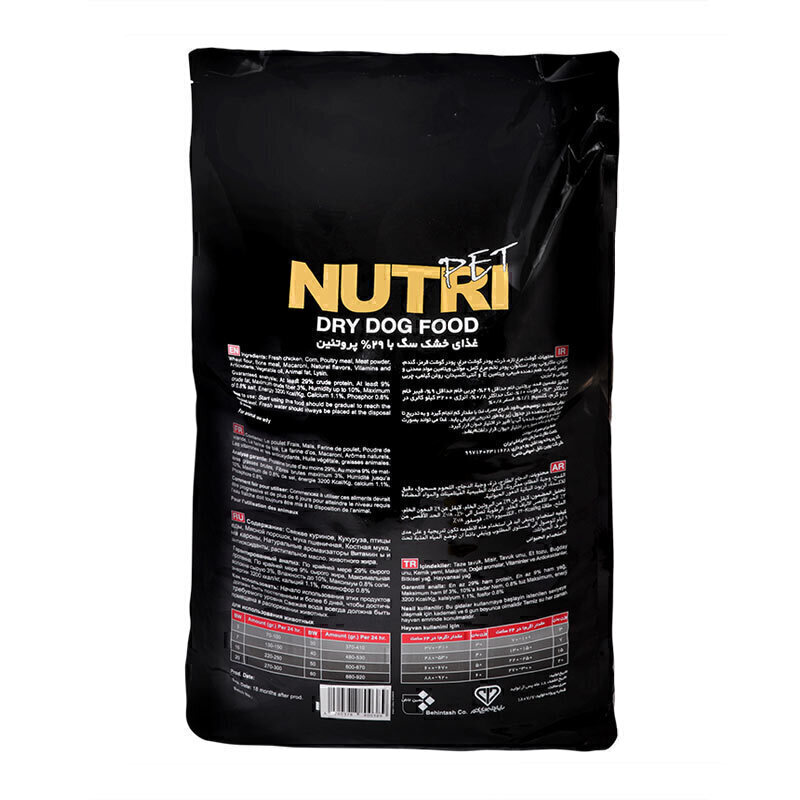 غذای خشک پروبیوتیک 29% پروتئین سگ بالغ نوتری پت حاوی گوشت مرغ تازه، ذرت، پودر گوشت مرغ، پودرگوشت قرمز، گندم، گلوتن، ماکارونی، پودر استخوان، پودر تخم مرغ کامل، مولتی ویتامین، مواد معدنی کمیاب، طعم دهنده طبیعی، ویتامینE، آنتی اکسیدان، روغن گیاهی، چربی حیوانی و لیزین می باشد.
