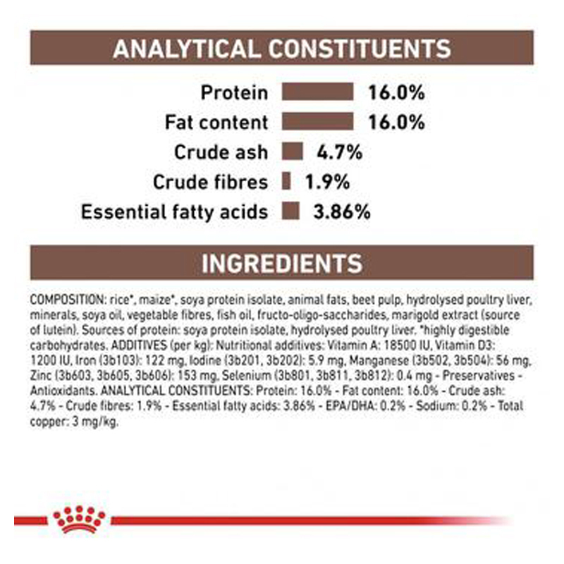 برنج*، ذرت*، چربی حیوانی، ایزوله پروتئین سویا، تفاله چغندر قند خشک، هیدرولیز کبد طیور، مواد معدنی، روغن سویا، الیاف گیاهی، روغن ماهی، فروکتو-الیگوساکاریدها، عصاره گل رز هندی [منبع لوتئین].