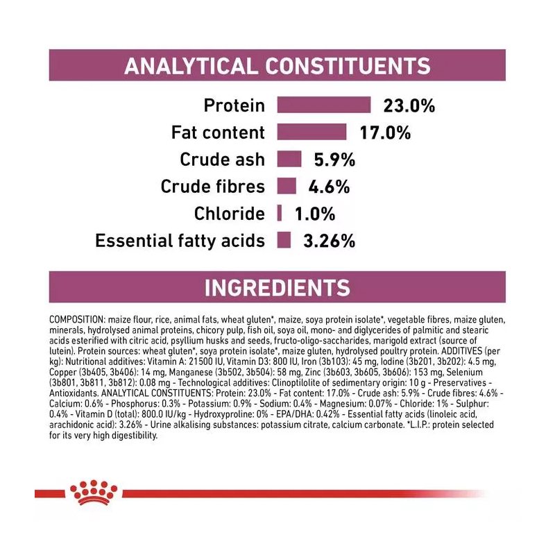 کنجاله ذرت، برنج، چربی حیوانی، گلوتن گندم*، الیاف گیاهی، گلوتن ذرت، پروتئین سویا ایزوله*، ذرت، پروتئین حیوانی (هیدرولیز شده)، لیگنوسلولز، مواد معدنی، پروتئین مرغ خشک، روغن ماهی، روغن سویا، مونو و دی گلیسیرید از اسیدهای پالمیتیک و استئاریک، استری شده با اسید سیتریک، فروکتو-الیگوساکاریدها، عصاره گل رز هندی.