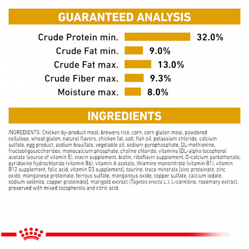 برنج، گلوتن گندم*، پروتئین مرغ خشک، آرد ذرت، چربی حیوانی، پروتئین های حیوانی هیدرولیز شده، گلوتن ذرت، مواد معدنی، الیاف گیاهی، روغن ماهی، روغن سویا، فروکتو-الیگوساکاریدها، آرد همیشه بهار.