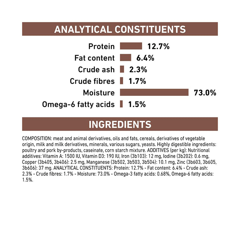 ویتامین A (1.500 IU/kg)، ویتامین D3 (190 IU)، آهن (12mg)، ید (0.6mg)، مس (2.5mg)، منگنز (10.1mg)، روی (37mg).