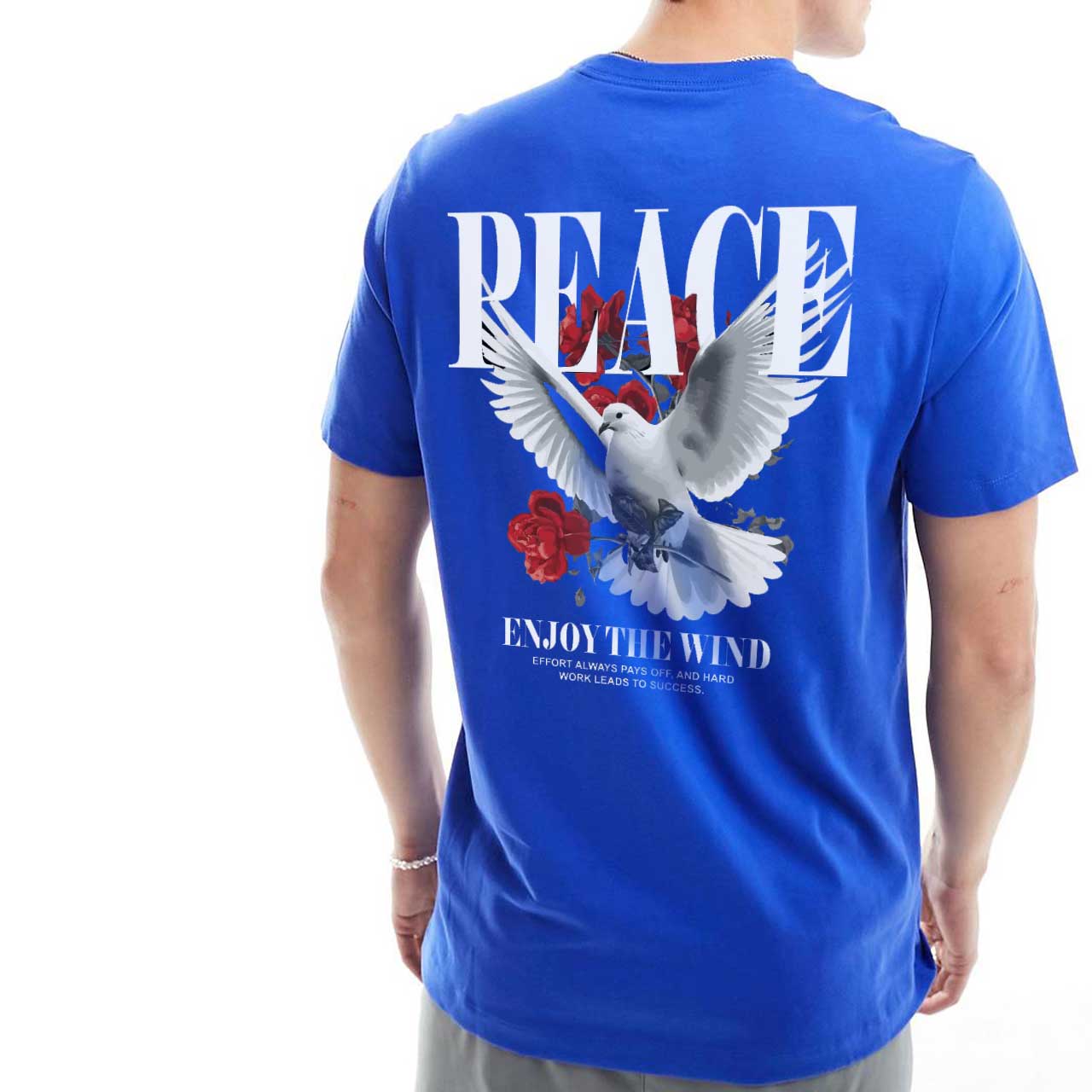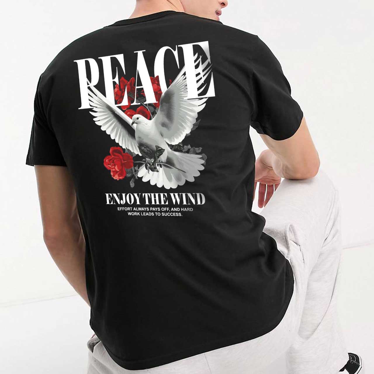 تیشرت نخی آستین کوتاه طرح پرنده صلح، نوشته انگلیسی بزرگ PEACE به معنی صلح، یک تصویر بزرگ از پرنده صلح مشهور در حال پر زدن با گلی سرخ در دهان و تعدادی نوشته انگلیسی را روی خود جا داده است. البته شاخه زیتون در نسخه اصلی تصویر پرنده صلح اینجا جای خود را به ابتکار هنری استفاده از گل رز سرخ داده است. عبارت ENJOY THE WIND به معنای از باد لذت ببر (که تداعی گر حس آزادی و رهایی است) در میانه های تیشرت به چشم می خورد. برگردان فارسی نوشته های پایین تیشرت Effort always pays off and hard work leads to success این می شود: تلاش همیشه نتیجه می دهد و سختکوشی منجر به موفقیت می شود.