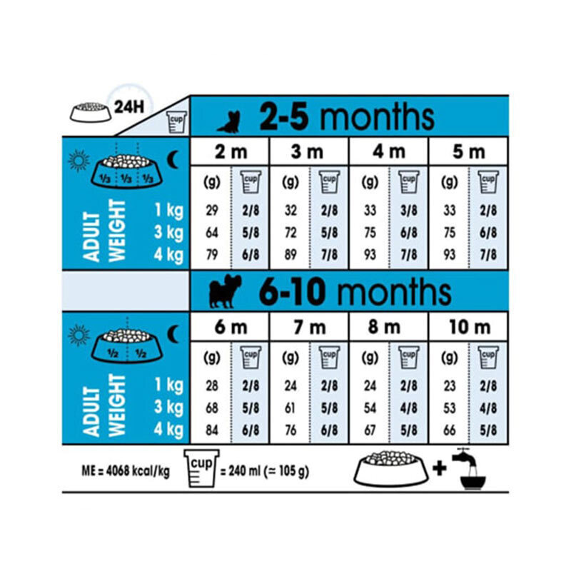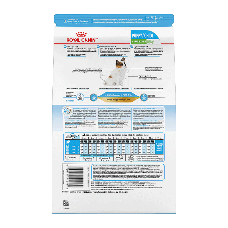 فرمولاسیون غذای ایکس اسمال پاپی رویال کنین کاملاً متناسب با نیازهای سگهای بسیار کوچک با وزن بالغ حداکثر 4 کیلوگرم تولید شده است. این غذا حاوی میزان مناسبی فیبر است که به عبور بهتر مواد غذایی از داخل روده و ارتقا کیفیت مدفوع کمک میکند. کالری این محصول متعادل است و به حفظ وزن ایده آل کمک میکند. برای تقویت سیستم ایمنی، ترکیبی ویژه از آنتی اکسیدانها همراه با ویتامین E در غذای توله سگ خیلی کوچک رویال کنین به کار رفتهاند. دانههای آن ترد بوده و طعمی عالی دارد. همچنین به لحاظ شکل و اندازه، کاملاً مناسب با دهان و فک این توله سگها تولید شده است. استفاده از این غذا برای سنین 2 تا 10 ماهگی توصیه میشود.