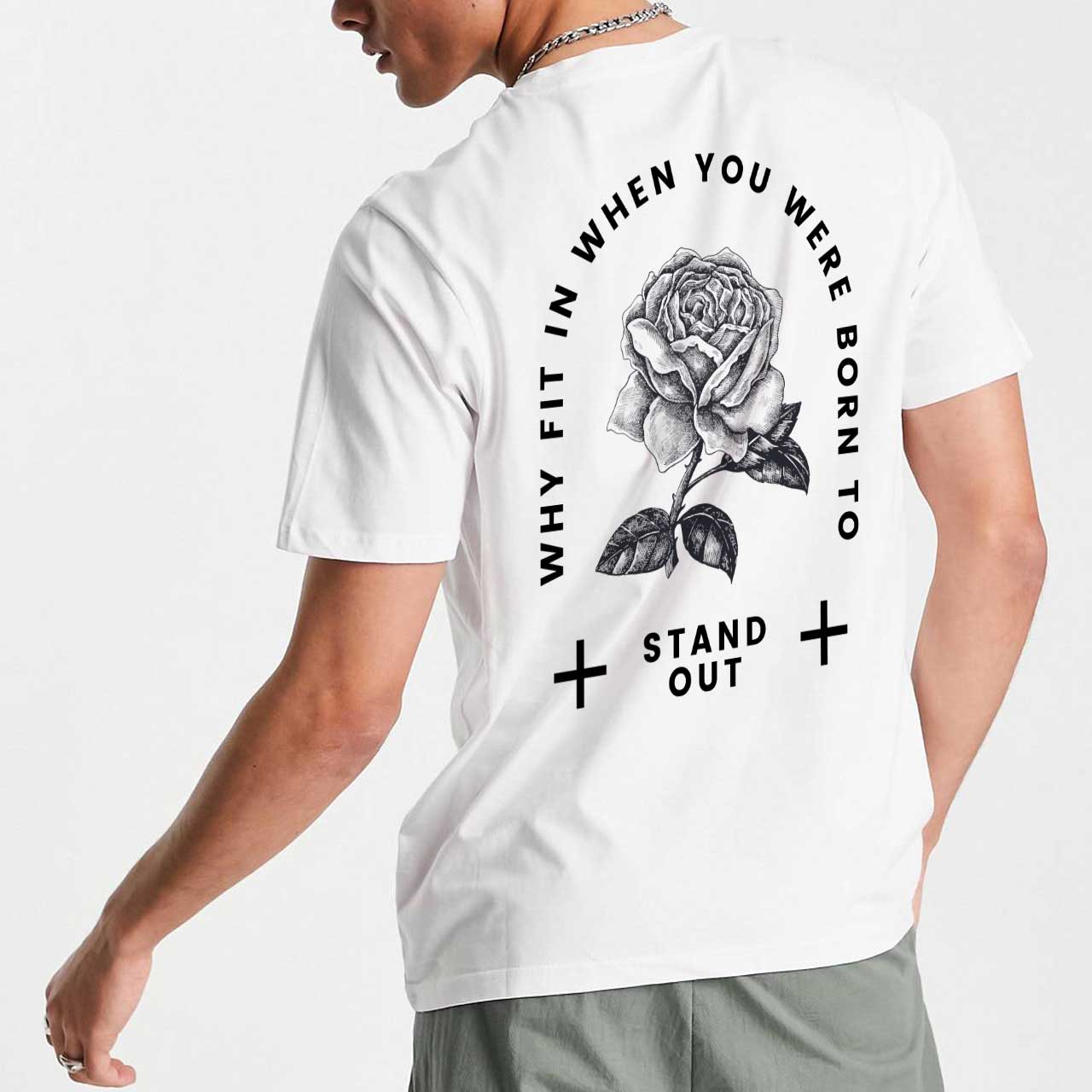 تیشرت طرح متمایز باش با نوشته های انگلیسی منحنی در پشت تیشرت همراه با یک گل، برای افرادی است که این سبک را برای استایل خود می پسندند.