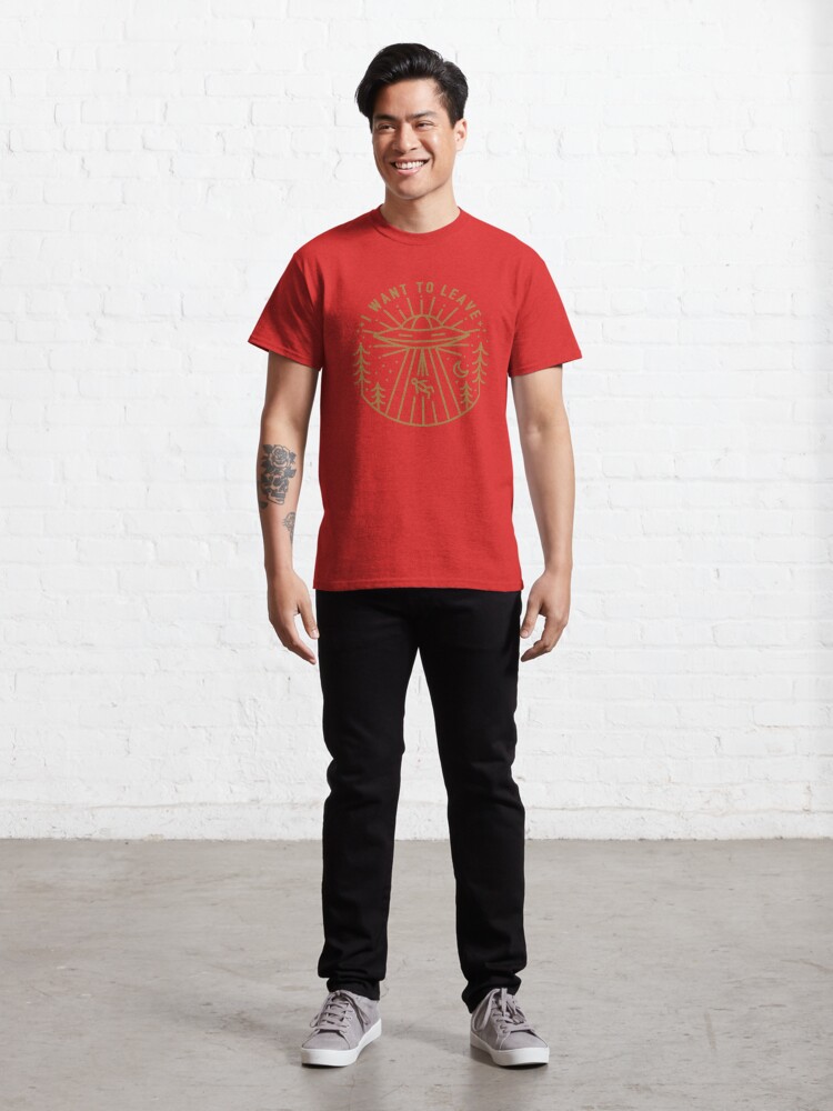 تیشرت نوین نقش طرح I Want To Leave تصویر انسانی را نشان می دهد که در حال رفتن به یک سفینه فضایی است.