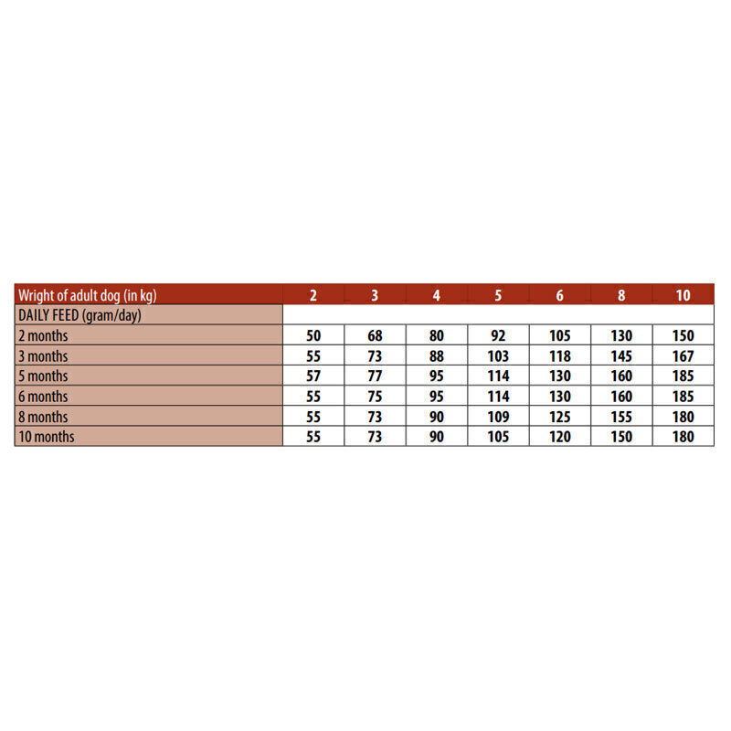 مصرف روزانه ممکن است به 3 وعده غذایی روزانه تقسیم شود. نیازهای غذایی فردی ممکن است به دلیل اندازه، سن و سطح فعالیت حیوان متفاوت باشد. مطمئن شوید که همیشه آب تمیز و تازه در دسترس داشته باشید. هنگامی که این محصول جایگزین نوع دیگری از خوراک و یا رژیم غذایی می شود، توصیه می شود آن را به تدریج در مدت حداقل یک هفته جایگزین کنید.