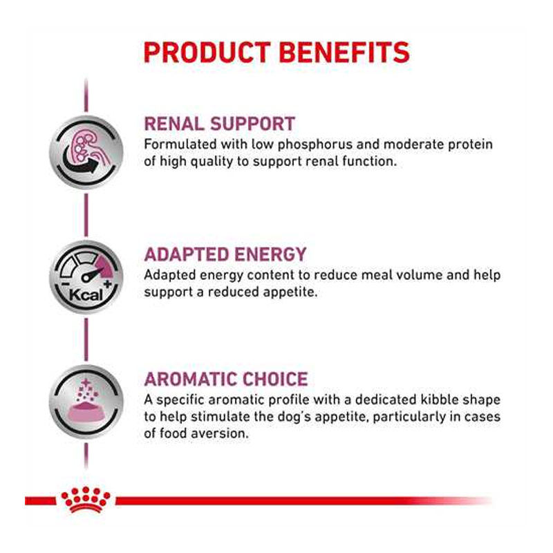 غذای خشک سگ رویال کنین مدل Renal یک غذای پرانرژی برای سگ است که به ویژه برای حمایت از عملکرد کلیه در موارد نارسایی مزمن یا موقت کلیوی، از طریق سطح پایین فسفر و پروتئین با کیفیت بالا، درست شده است.