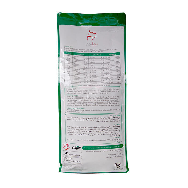فرمولی که سلبن برای سگ های بالغ نژاد کوچک ارائه کرده برای حیوانی فعال و بالغ مناسب است . در این فرمول علاوه بر ویتامین ها و مواد معدنی لازم از گلوکزامین و ال کارنتین استفاده شده که بهترین انتخاب برای سگ بالغ شما می باشد و وضعیت بدنی و وزنی حیوان را در جایگاهی سالم با تغذیه مناسب نگه می دارد. در این فرمول از حبوبات نیز استفاده شده که باعث هضم آرام غذا میشود. سگ های بالغ ، طعم و سایز کوچک غذای خشک را دوست خواهند داشت و شما هم ازاین غذا رضایتمند خواهید بود.