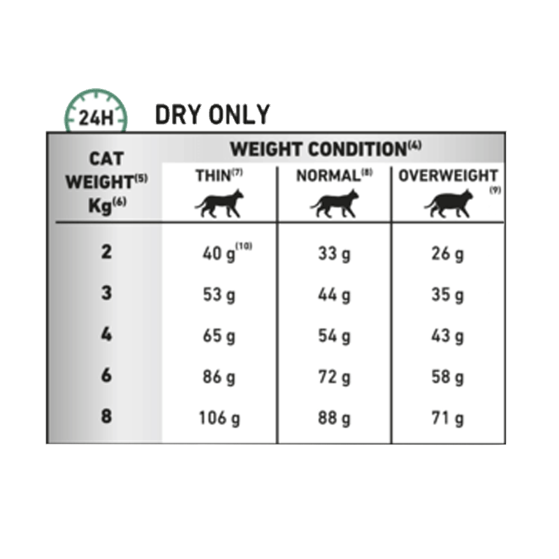 | وزن گربه | پوچ | مقدار باری لاغر | لاغر (cups) | مقدار وزن معمولی | معمولی (cups) | مقدار اضافه وزن (grams) | اضافه وزن (cups) |