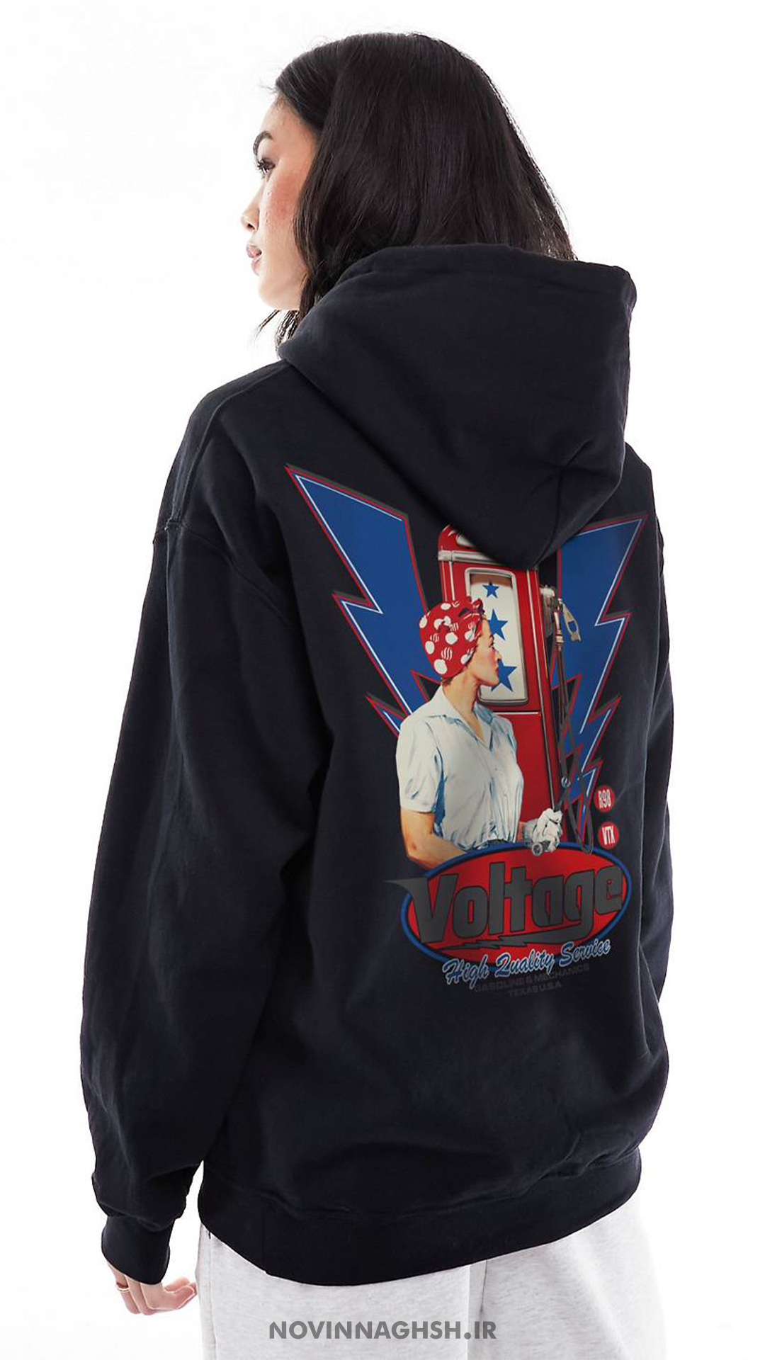 هودی طرح ولتاژ VOLTAGE با سایزبندی، تهیه شده از پارچه نخ پنبه ضخیم کرک دار است.