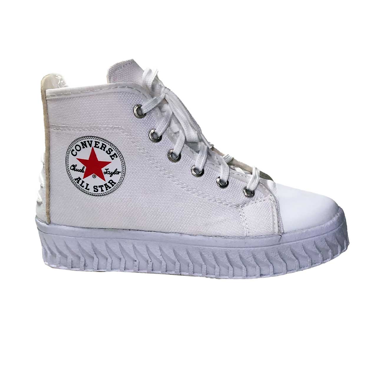 رویه کفش کتانی کانورس آل استار پارچه ای برزنتی و دارای پانچ های فلزی بزرگ برای گردش هواست؛ زیره کفش کتونی اسپرت آل استار کانورس سفید است و با ضخامت زیادی که دارد، فشارهای وارده به پاها را تا حدودی کاهش می دهد.