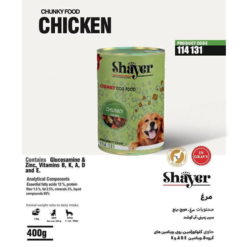 کنسرو غذای سگ با طعم مرغ شایر Shayer Chunky Chicken وزن 400 گرم
