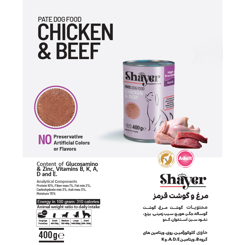 کنسرو غذای سگ با طعم مرغ و گوشت شایر Shayer Pate With Chicken & Beef وزن 400 گرم