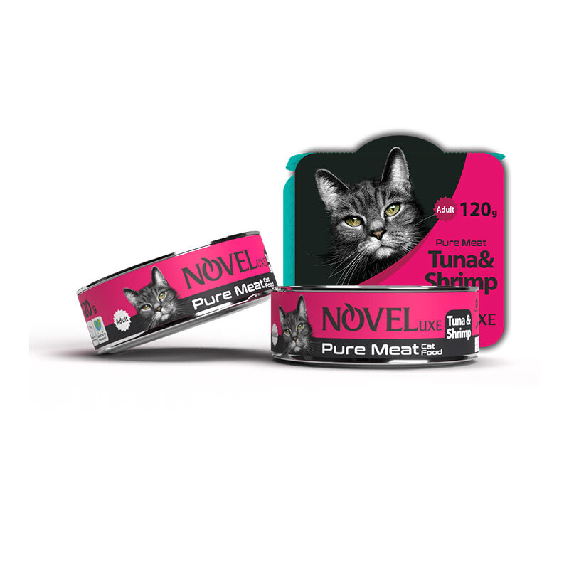 کنسرو گربه نوول با طعم ماهی تن و میگو به همراه سس گوشت میباشد. پروتئین های حیوانی موجود در این کنسرو Novel، اولین ماده در ترکیبات می باشد که کیفیت جذب بالا و هضم پذیری زیادی دارد. کنسرو گربه نوول حاوی اسید های چرب غیر اشباع که به سلامت مو و پوست گربه کمک می کند. میگو موجود در غذا علاوه بر اینکه منبع غنی ویتامین های گروه B می باشد غذا را لذیذ تر و خوش خوراکتر می سازد. سبزیجات موجود در غذا علاوه بر ویتامین ها و مواد معدنی مفید حاوی فیبر بالاست که به بهبود و سلامت دستگاه گوارش گربه کمک شایانی می کند. در کنسرو گوشت خالص ماهی تن و میگو نوول 120 گرمی مخصوص گربه از هیچ گونه صمغ و ژلاتینی در محصولات استفاده نشده است. این مواد در طولانی مدت می تواند در حیوان اثرات سو داشته باشد.
